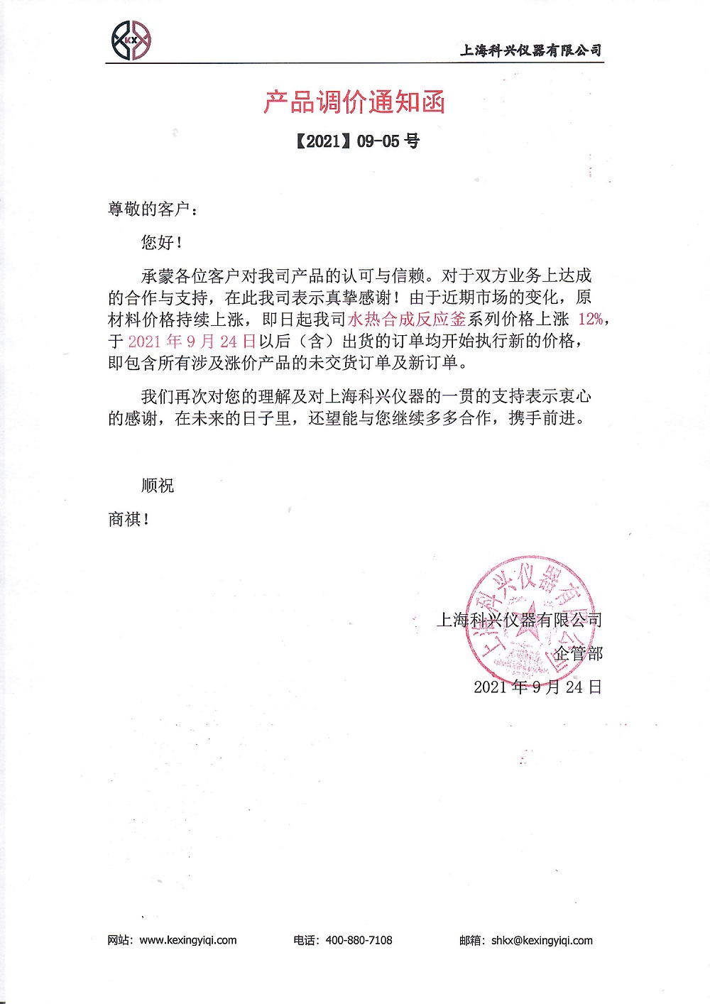 承蒙各位客戶(hù)對(duì)我司產(chǎn)品的認(rèn)可與信賴(lài)。對(duì)于雙方業(yè)務(wù)上達(dá)成的合作與支持,在此我司表示真摯感謝!由于近期市場(chǎng)的變化,原材料價(jià)格持續(xù)上漲,即日起我司水熱合成反應(yīng)釜系列價(jià)格上漲 12%,2021 年 9 月 24 日以后(含)出貨的訂單均開(kāi)始執(zhí)行新的價(jià)格,既包含所有涉及漲價(jià)產(chǎn)品的未交貨訂單及新訂單。