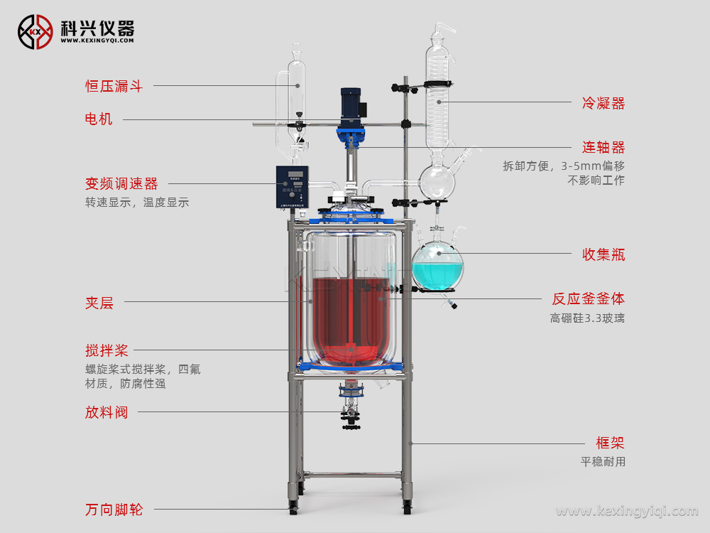 雙層玻璃反應(yīng)釜為雙層玻璃設(shè)計(jì),內(nèi)層放入反應(yīng)溶媒可做攪拌反應(yīng),夾層可通上不同的冷熱源(冷凍液,熱水或熱油)做高溫反應(yīng)或低溫反應(yīng)。